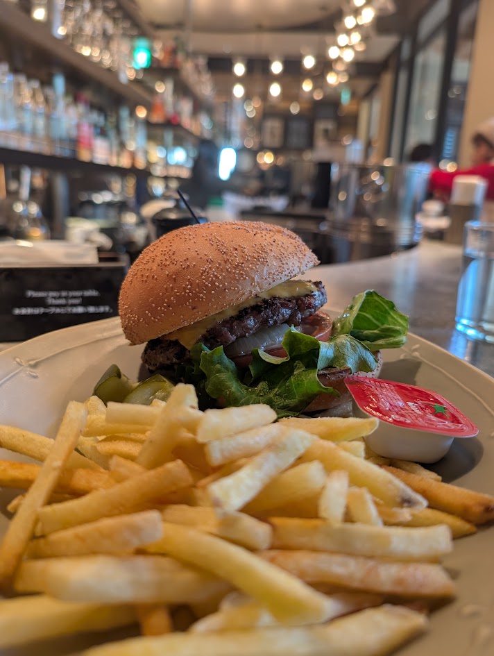 “R”バーガーというのがベーシックなバーガーになりますが、こちらはチーズが載っているタイプです。ほかにもフィッシュバーガーがありますが、全部で3種になります。フレンチフライはカリカリタイプ。一人で訪問したのでセンターオーバルテーブルのカウントに案内されました。ゆったりしたカウントチェアで店内全体を見渡せるので悪くないです。ランチの時は(ドレッシングがおいしい)サラダが付きます。/1650 (Jan/2026)
