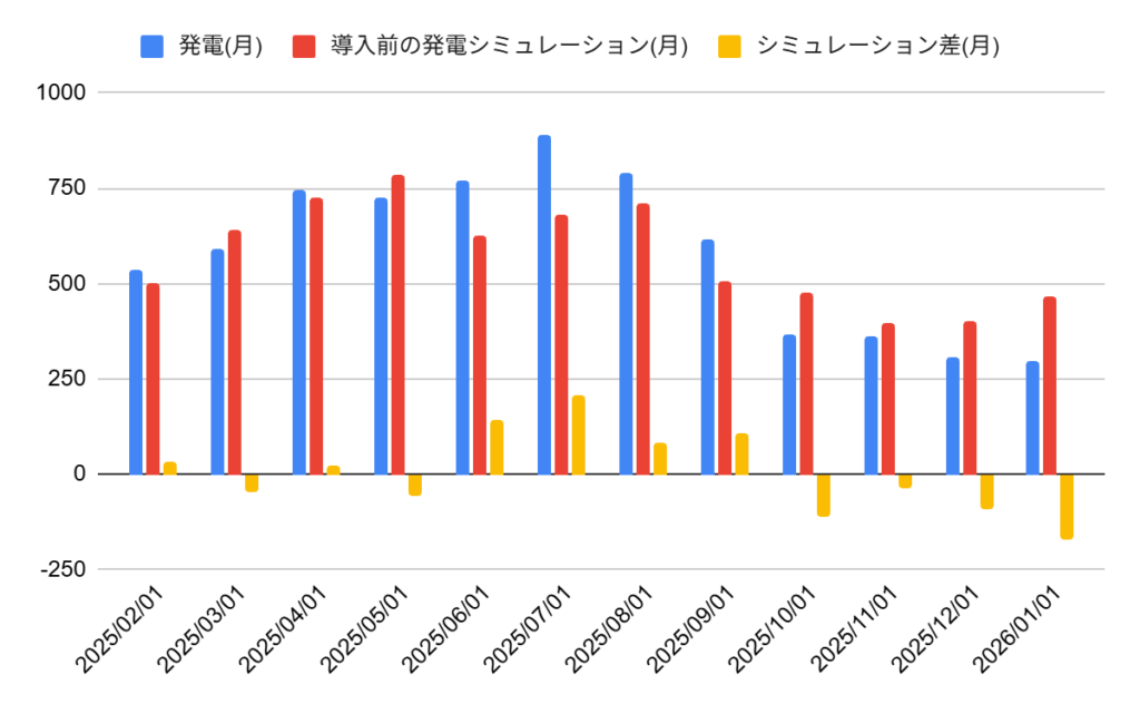 ちょうど2026年1月末でPVを導入してから1年経過したので、導入前にメーカーRISE.Re.RISE-G3 440〈6.44kW〉のシミュレーションと発電結果を報告します。