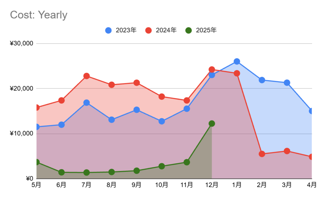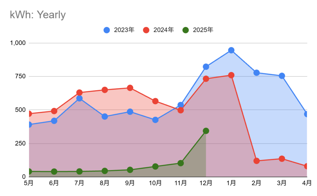 ここでは、売電を含まれておりません。2025年2月に導入してから、売電が開始されたのは2025年9月です。7か月ほどかかりました。時期的に発電量が減ってからとなるため、機微な売上となりますが、9月は買電よりも売電の方が大きくプラスになっています。また、上記のCostグラフは、2025年6月から電力会社を変えておりますので、2月から5月まではTEPCOの電化上手の費用になっています。冬は惨敗ですね。夜間は布団に入っているためあまりエアコンやエコキュート湯沸かしは働いておりませんが、もちろん0ではありません。夜分の湯貯めでエコキュートが空っぽになった場合は明朝お湯が使えなくなると困るため夜間に湯沸かしも走ります。